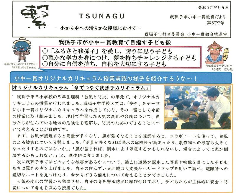 1学期に、三小で小中一貫オリジナルカリキュラムの授業を行い、その様子が我孫子市教育委員会が発行する広報紙「つなぐ」で紹介されました。
