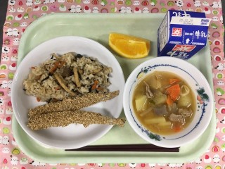 10月22日の給食 公開日 2025/10/22 更新日 2025/10/23 給食 (今日の献立)牛乳 ひじきご飯 ししゃものごま焼き 豚汁 オレンジ 今日は、小麦粉と水と薄口しょうゆで作ったバッター液をししゃもにからめ、ごまをまぶしてオーブンで焼きました。ごまの香りが香ばしく、おいしく仕上がりました。