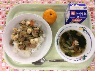 牛乳 豆腐の旨煮丼 わかめスープ みかん