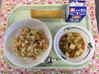 牛乳 焼肉チャーハン 豆腐とえびの中華煮 手作りスイートポテト春巻き