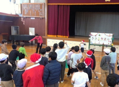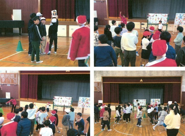 ひまわり学級の全学級合同で今回の会を実施し、体育館でレクをして盛り上がりました!今回、司会進行を務めたのは、1年生の子供たちです。その様子からも、学校生活の中で1年生の皆さんが大きく成長したことが伝わり頼もしく思います。サンタの衣装等に身を包み、子供たちの気分はクリスマスです!