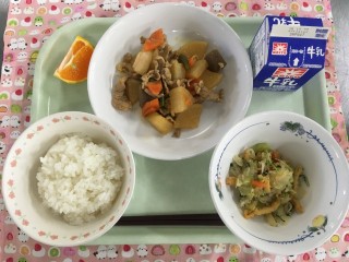 12月16日の給食 公開日 2025/12/16 更新日 2025/12/16 給食 (今日の献立)牛乳 ごはん 豚肉と大根の煮込み 水菜とじゃこのサラダ はやか 今日のサラダには、オーブンでカリカリに焼いた油揚げとじゃこが入っています。かめばかむほど、うま味が感じられておいしいサラダです。