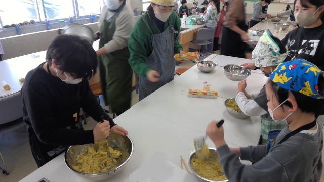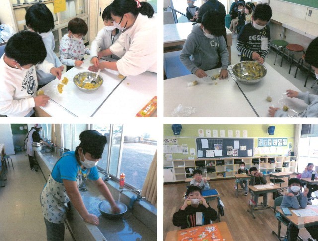 家庭科室で、ひまわり学級の皆さんがそろって、甘くておいしいスイートポテトをつくりました。高学年の児童がリーダーとなって、みんな仲良く調理をすることができました。そして、出来上がったスイートポテトは、みんなでおいしくいただくことができましたね!