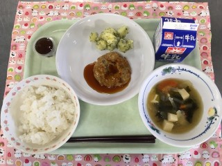 牛乳 ごはん 手作りきんぴらハンバーグ 青のりポテト 豆腐とわかめのみそ汁 ひとくちぶどうゼリー