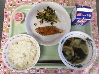 牛乳 ごはん ぼらの唐揚げ にんじんソース 野菜の海苔和え かぶのみそ汁 ひとくちいちご牛乳プリン