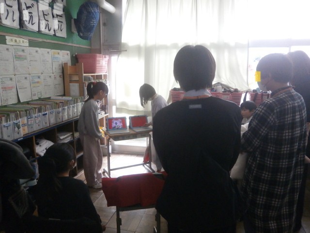 発表者の児童は、画面を友達に見せながらタブレットを操作しつつ、説明をすることができます。参観する児童は、発表者が大きな声を出さなくても耳を寄せて間近で見たり聞いたりすることができます。参観してくださる保護者の方も、発表しているお子さんのすぐ近くに立って様子を参観することができます。そして、教室を広く使って、それぞれの場所で、それぞれのタイミングで発表を行うことができるところも、大きなメリットです。