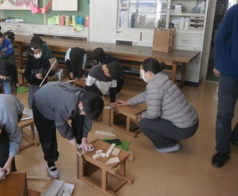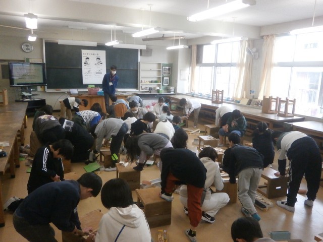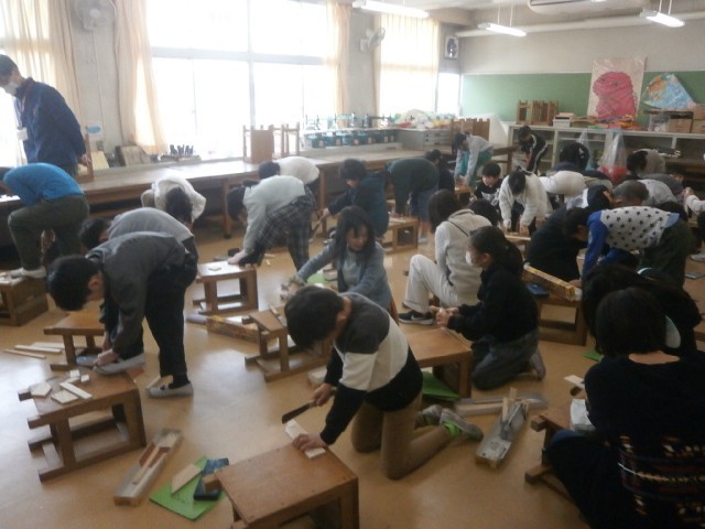 例年、三小では保護者ボランティアの皆さんの協力を得て、図工ののこぎりを使った学習を行っています。今日も、保護者ボランティアの皆さんが、子供たちを温かく見守ってくれていました。また、木材を斜めに切る時や小さい木材を切る時は、いつもより難しいし工夫が必要ですので、そのような時には、そっと手を差し伸べてくれます。