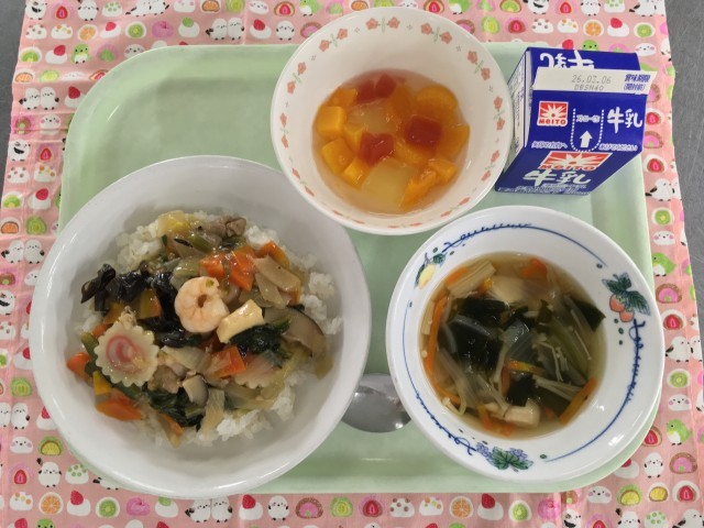 2月27日の給食 公開日 2026/02/27 更新日 2026/02/27 給食 (今日の献立)牛乳 中華丼 わかめとえのきのスープ サイダーフルーツポンチ 今日のサイダーフルーツポンチは、6年生のリクエストメニューです。みかん缶と黄桃缶、いちごゼリー、はちみつレモンゼリーが入っています。