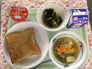 セサミトースト 海藻サラダ 春野菜のポトフ ヨーグルト 牛乳