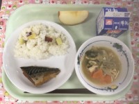 (今日の献立)牛乳 さつまいもご飯 さばのオレンジ煮 お講汁 りんご 今日は、我...