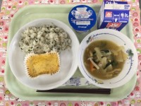 (今日の献立)牛乳 しらす入りわかめご飯 五目卵焼き 呉汁 ヨーグルト 五目卵焼...