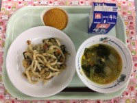(今日の献立)牛乳 焼きうどん わかめとコーンのスープ 米粉のキャロットケーキ ...
