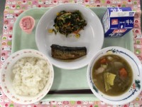 (今日の献立)牛乳 ごはん いわしのカレー風味煮 野菜ののり和え さつまいものみ...