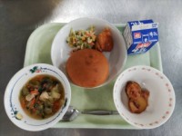 (今日の献立)牛乳 三色ピラフ スペイン風オムレツ アルファベットスープ みかん...