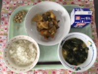 (今日の献立)牛乳 ごはん 鶏肉と野菜のごま煮 わかめとえのきのみそ汁 きなこ大...