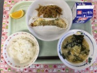 (今日の献立)牛乳 ごはん 手作りきんぴらハンバーグ 青のりポテト 豆腐とわかめ...