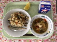 (今日の献立)牛乳 焼き鳥ごはん ししゃもの磯辺揚げ 呉汁 バナナ ししゃもの磯...