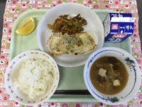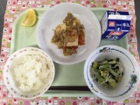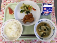 (今日の献立)牛乳 ごはん 鶏の照り焼き ベーコンの野菜炒め じゃがいもと大根の...
