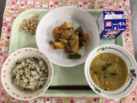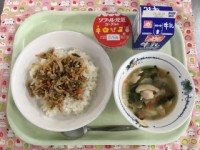 (今日の献立)牛乳 しらす入りわかめご飯 鶏肉と野菜のごま煮 白菜とえのきのみそ...
