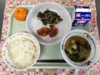 (今日の献立)牛乳 ごはん ヤンニョムチキン ナムル わかめとえのきのみそ汁 み...