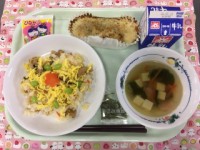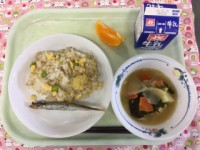(今日の献立)牛乳 焼肉チャーハン わかめとコーンのスープ 手作りスイートポテト...