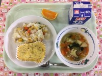 (今日の献立)牛乳 カラフルピラフ ねぎのキッシュ風 アルファベットスープ 清見...