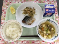 (今日の献立)牛乳 ごはん さばのごまだれ焼き 大豆の五目煮 けんちん汁 いちご...