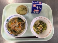 (今日の献立)牛乳 五目ソース焼きそば 豆腐のぴりからスープ 米粉のキャロットケ...