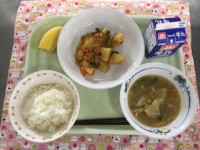 【今日の献立】ごはん 鶏肉と野菜のごま煮 スナップえんどうのマヨあえ オレンジ ...