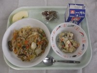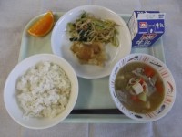 【牛乳・ごはん・豚肉とアーモンドのソース炒め、豆腐とじゃがいものスープ・みかん】...
