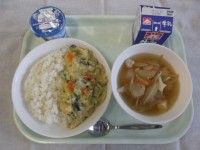 【牛乳・ごはん・豚肉と野菜の卵あんとじ・豆腐とじゃがいもの中華スープ・ヨーグ...
