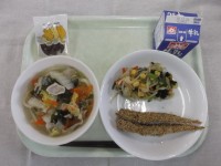 【牛乳・豚肉と白菜の塩うどん・ししゃものごま焼き・野菜ののり和え・黒糖大豆】...
