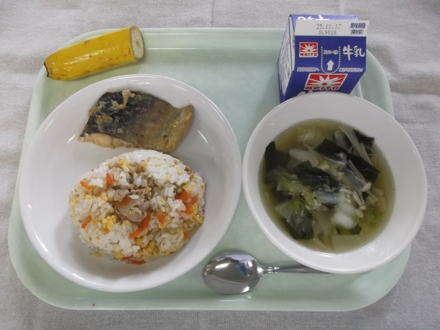 今日の給食 11月10日 公開日 2025/11/10 更新日 2025/11/10 給食 【牛乳・焼肉チャーハン・シイラの中華風みそ焼き・白菜とえのきの中華スープ・バナナ】 今日の主菜は、シイラをにんにくやごま油の風味を利かせた、中華風のみそ焼きです。シイラは、あっさりした味の魚なので、いろいろな料理でおいしく食べられます。今日のみそ味はみその量を少なめにしているので、シイラのうま味を感じつつ、みそダレの味もしっかり味わえる仕上がりにしています。