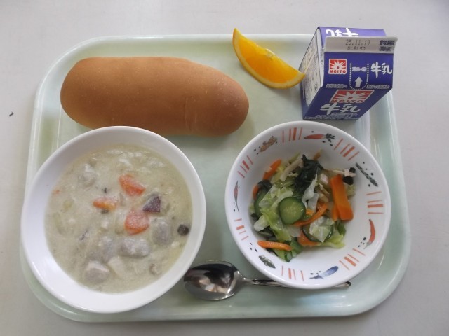 今日の給食 11月12日 公開日 2025/11/12 更新日 2025/11/12 給食 【牛乳・コッペパン・さつまいもときのこのシチュー・グリーンサラダ・オレンジ】 今日のシチューは、さつまいもとしめじやエリンギなどのきのこをたっぷり入れた、秋の味覚満載シチューです。さつまいもの甘みがシチューと一体となり、ほのかに甘みの感じられる味となっています。また、最近ぐっと涼しくなってきたこともあるので、温かいシチューは心もポカポカにしてくれる感じがします。本日の千葉県産食材:牛乳、小松菜