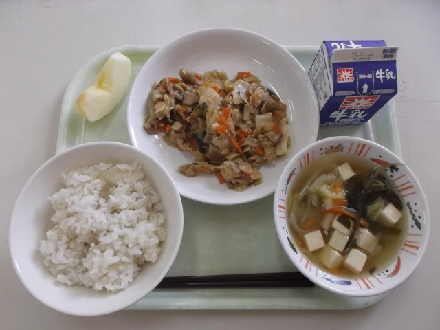 【牛乳・ごはん・豚肉とキャベツのアーモンド炒め・豆腐と白菜のスープ・りんご】