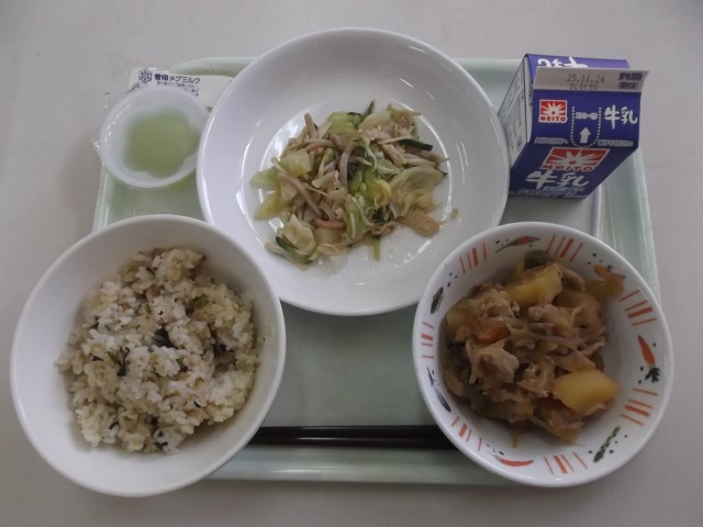 【牛乳・ツナと青菜の混ぜごはん・肉じゃが・キャベツとえのきの和え物・青りんごゼリー】