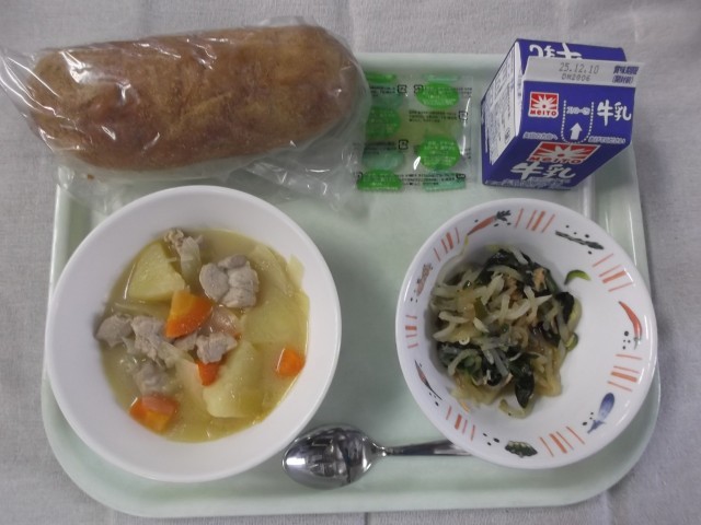 【牛乳・きな粉揚げパン・ひよこ豆と豚肉の洋風煮・大根サラダ・果汁グミ】
