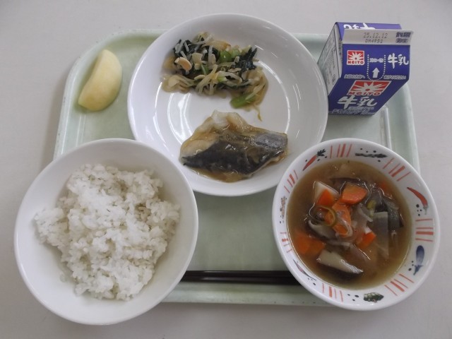 【牛乳・ごはん・サワラの出汁あんかけ・小松菜のアーモンド和え・けんちん汁・りんご】