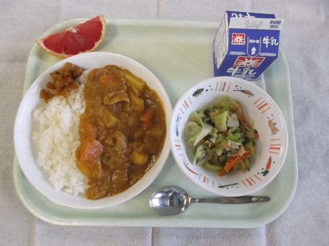 【牛乳・ポークカレーライス・福神漬け・ツナとキャベツのサラダ・グレープフルーツ】