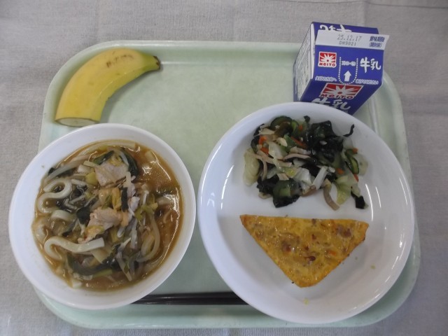 【牛乳・豚キムチうどん・肉じゃが風卵焼き・わかめとキャベツの和え物・バナナ】