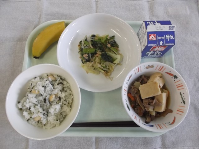 【牛乳・わかめと大豆の混ぜごはん・肉豆腐・小松菜とツナの和え物・バナナ】