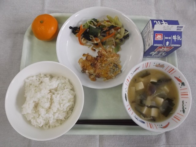 【牛乳・ごはん・タラのパリパリ焼き・野菜ののり和え・じゃがいもと豆腐のみそ汁・みかん】