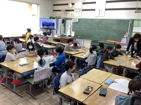 1年生は生活科「もうすぐ2年生」という学習を行い、新1年生に向けて学校紹介動画を作成すること