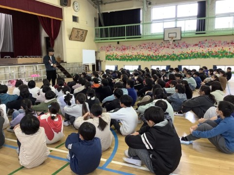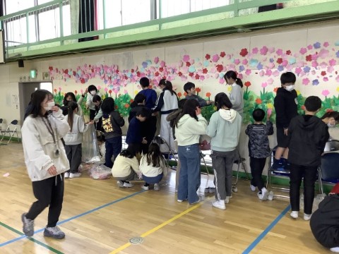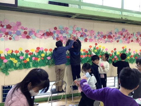 6年生を送る会に向けて、卒業式に向けて、1~5年生が体育館の装飾を作成・掲示しました。