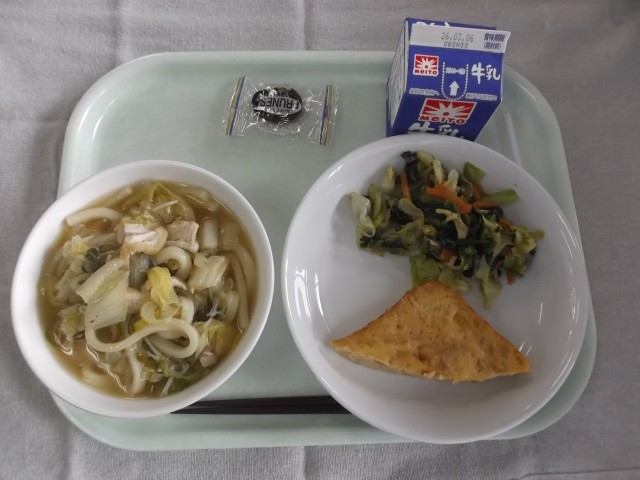 【牛乳・鶏南蛮うどん・ツナじゃが卵焼き・キャベツと青菜のおかか和え・ドライプルーン】