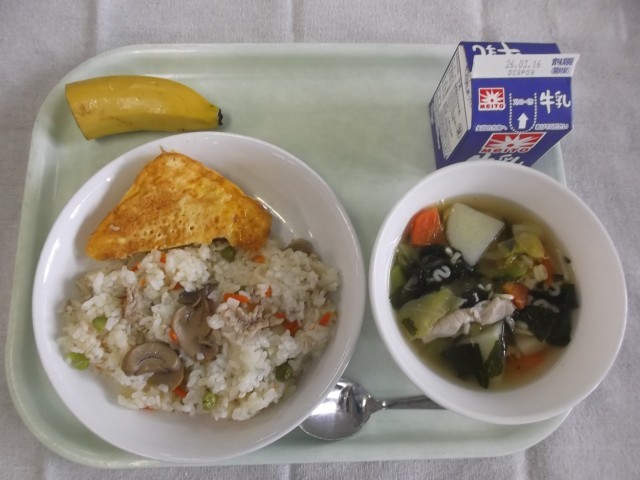 【牛乳・ポークピラフ・ツナ入り卵焼き・ABCスープ・バナナ】