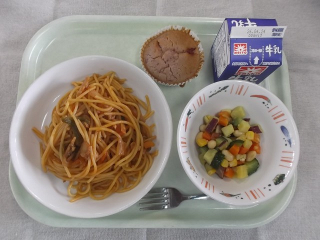 今日の給食 4月17日 公開日 2026/04/17 更新日 2026/04/17 給食 【牛乳・スパゲティナポリタン・大豆とさつまいものサラダ・米粉のいちごケーキ】 今日のこんだては、日本生まれのスパゲティであるナポリタンです。四小のナポリタンはハムとウインナーに加え、玉ねぎやマッシュルーム、ピーマンなど野菜もたくさん使っています。味付けはケチャップとトマトピューレを合わせた中に、中農ソースを隠し味に加え、味に深みを出しています。本日の千葉県産食材:牛乳、さつまいも
