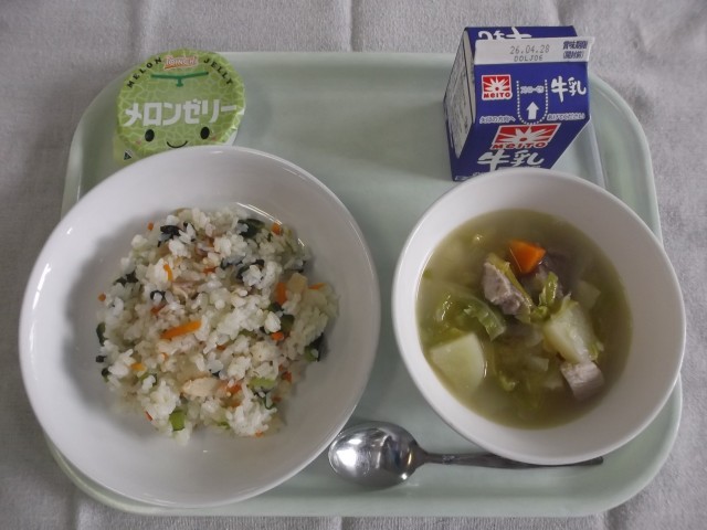 【牛乳・ベーコンと青菜のピラフ・ポトフ・メロンゼリー】