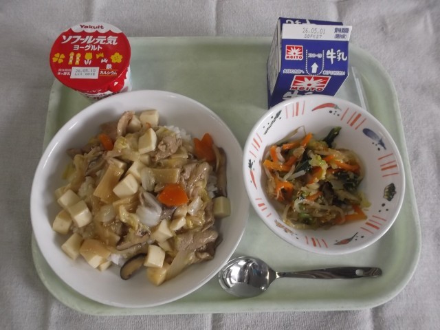 【牛乳・豆腐と野菜のあんかけ丼・もやしとキャベツのナムル・ヨーグルト】