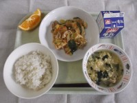 【牛乳・ごはん・豚肉とカシューナッツの炒め物・豆腐とチンゲンサイのスープ・いよか...